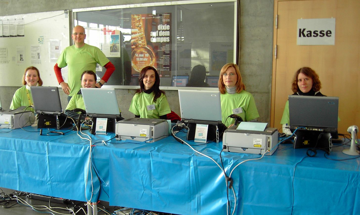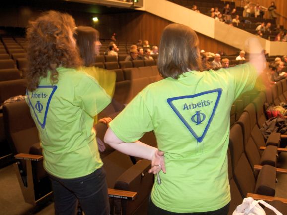 Die Organisatoren der Tagung, Mitarbeiter des Tagungsbüros und studentischen Hilfskräfte tragen farbige Namensschilder und Ф-T-Shirts. Sie stehen Ihnen als Ansprechpartner für Fragen zur Verfügung.